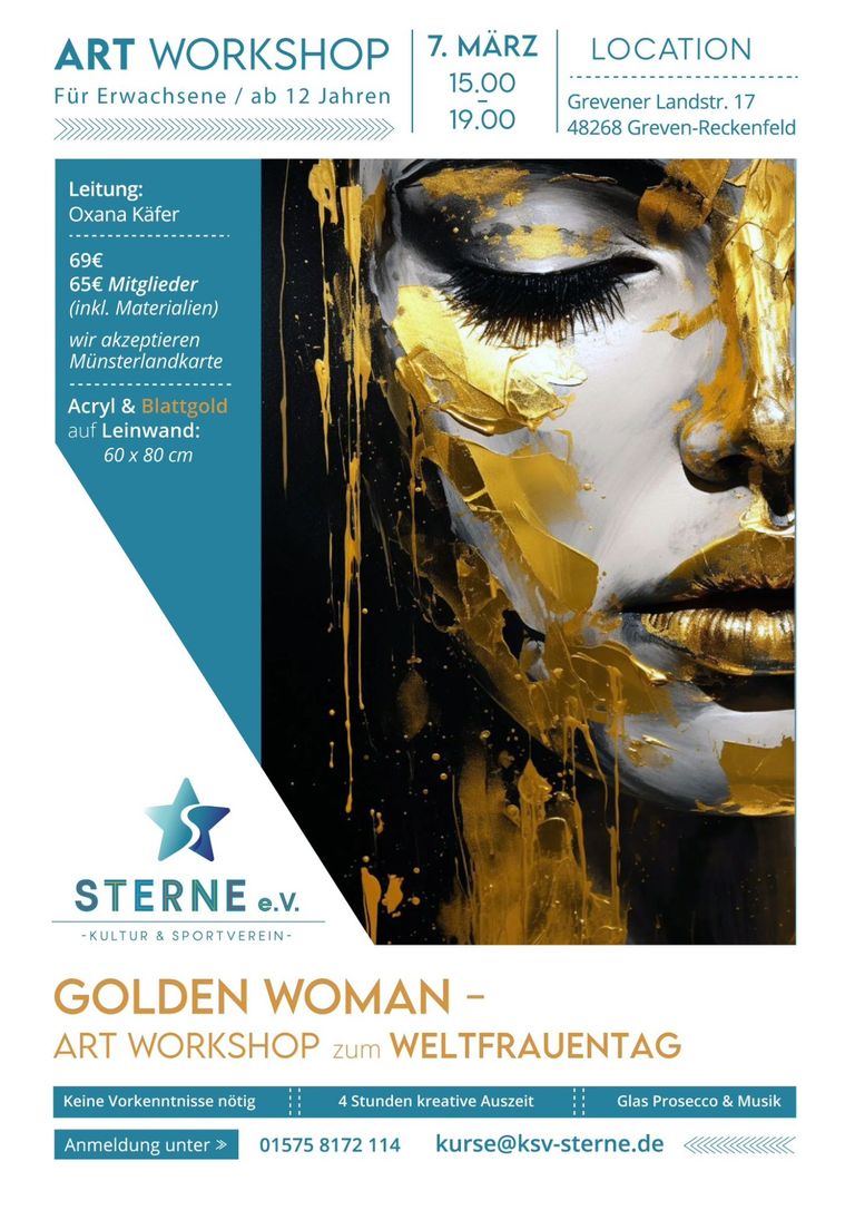 Erschaffe dein eigenes ausdrucksstarkes Kunstwerk – eine „Golden Woman“ mit Acryl & Blattgold auf Leinwand (60x80 cm).