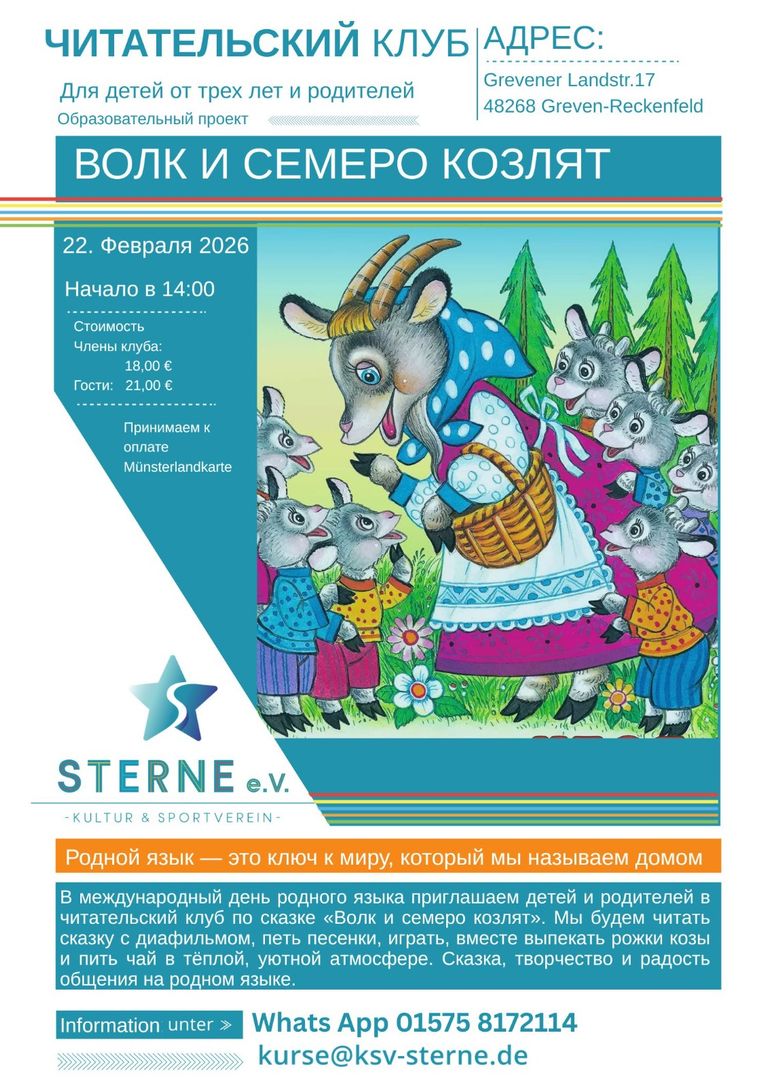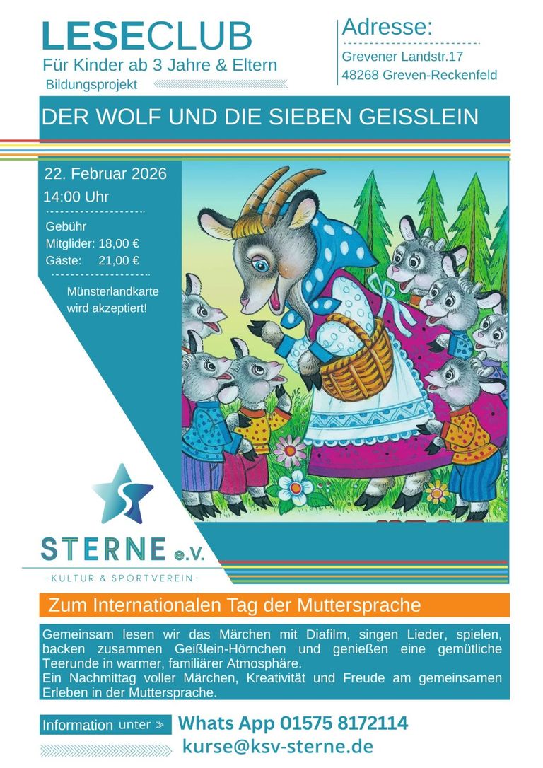 wir laden euch herzlich zu einem märchenhaften Nachmittag ein, bei dem der Wolf und die sieben Geißlein lebendig werden. Gemeinsam tauchen wir in die Welt der Märchen ein und erleben Lesen, Spielen und Kreativität in einer warmen Atmosphäre.