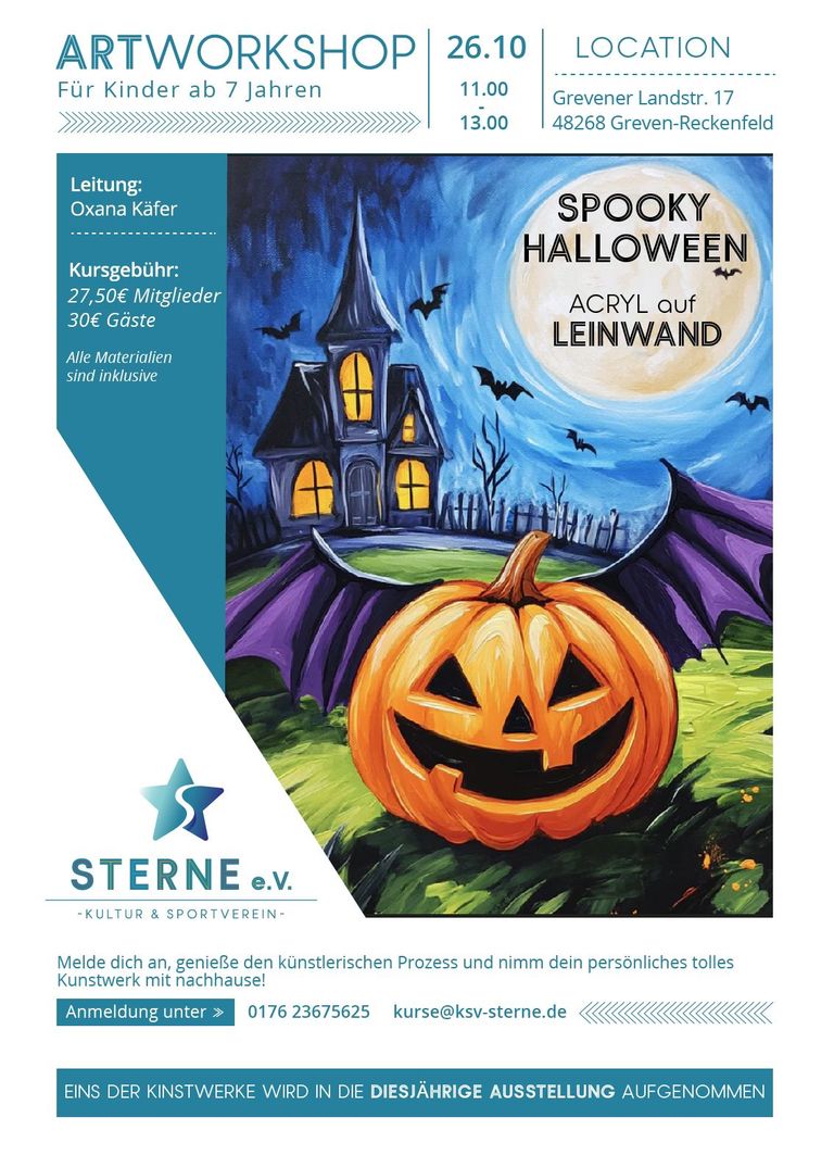 In diesem Workshop gestalten Kinder und Erwachsene ihr ganz persönliches Halloween-Kunstwerk mit Acrylfarben auf Leinwand.